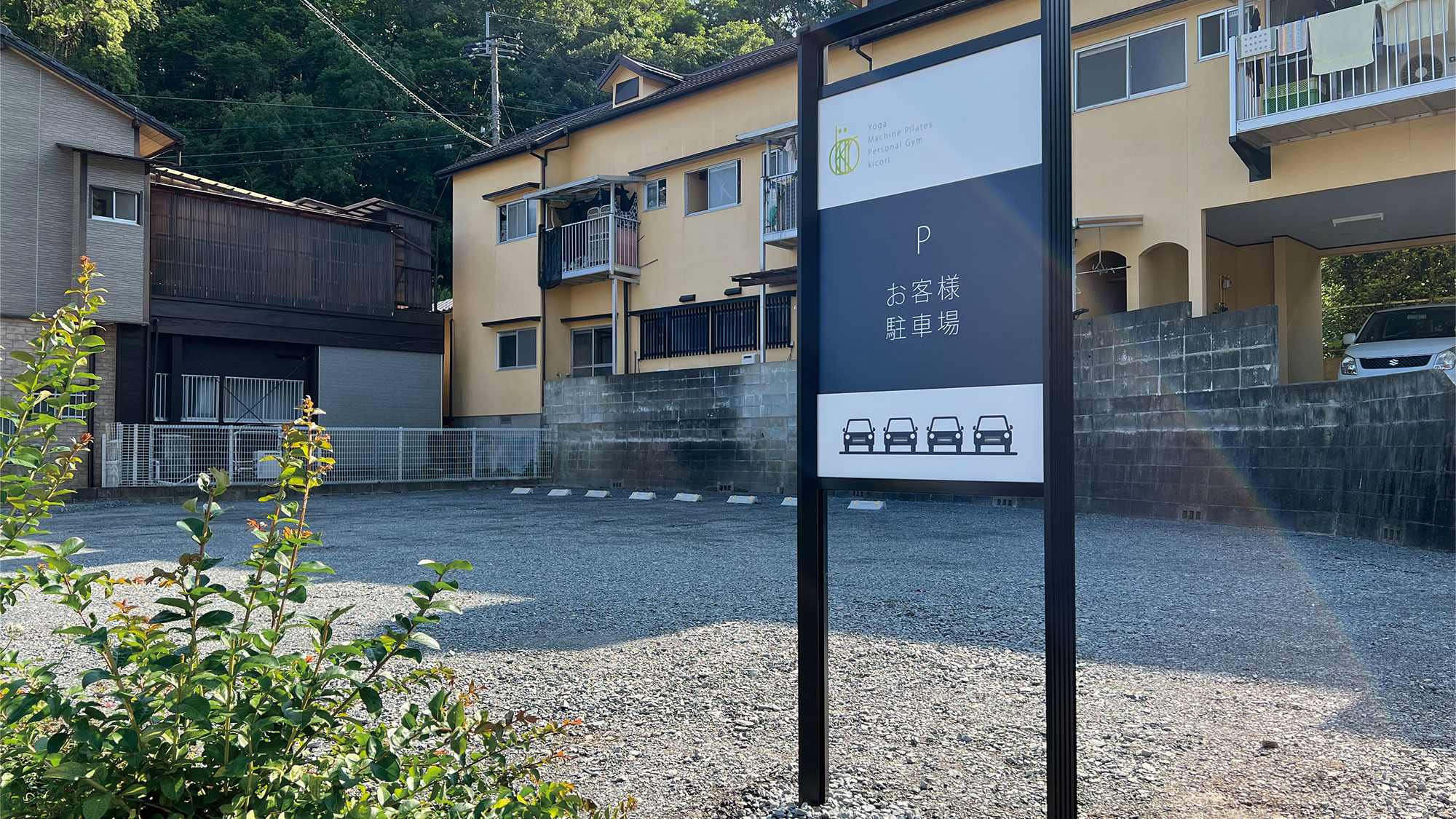 コチラの駐車場にお車をお止めいただき、上り坂を道なりにのぼっていくとスタジオに到着します。