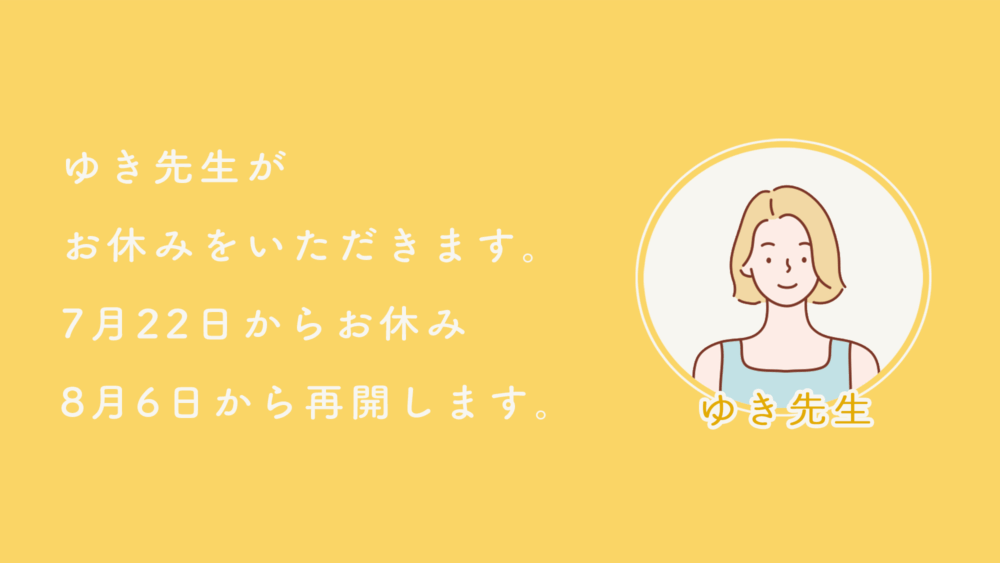 毎週火曜日18:00、土曜日18:00、土曜日19:30のレッスンを担当しているゆき先生が、7月22日からお休みをいただきます。